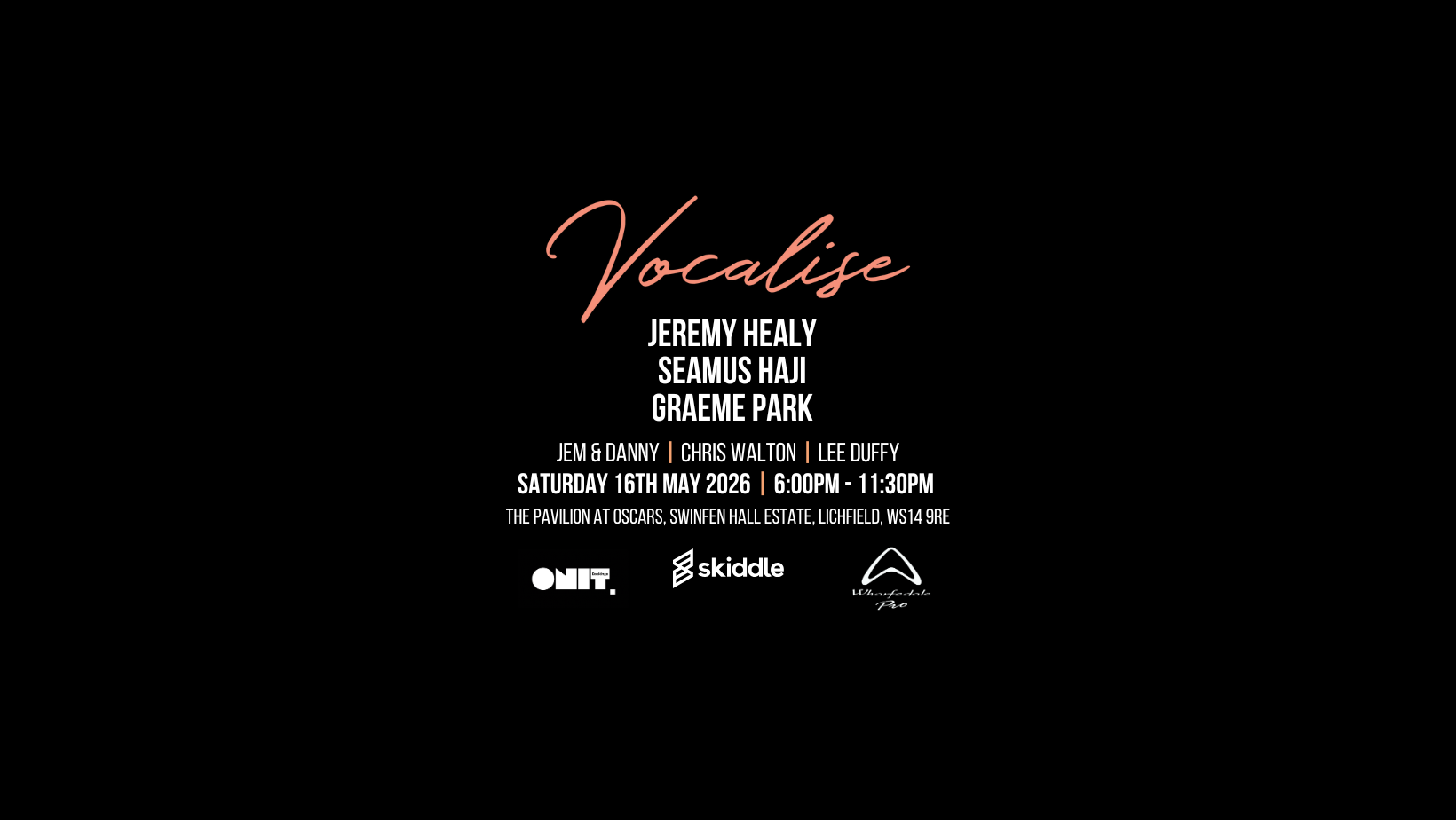 Join me alongside Seamus Haji and Jeremy Healy for Vocalise at The Pavilion at Oscars on the Swinfen Hall Estate in Lichfield on Saturday 16th May. Limited tickets from Skiddle.