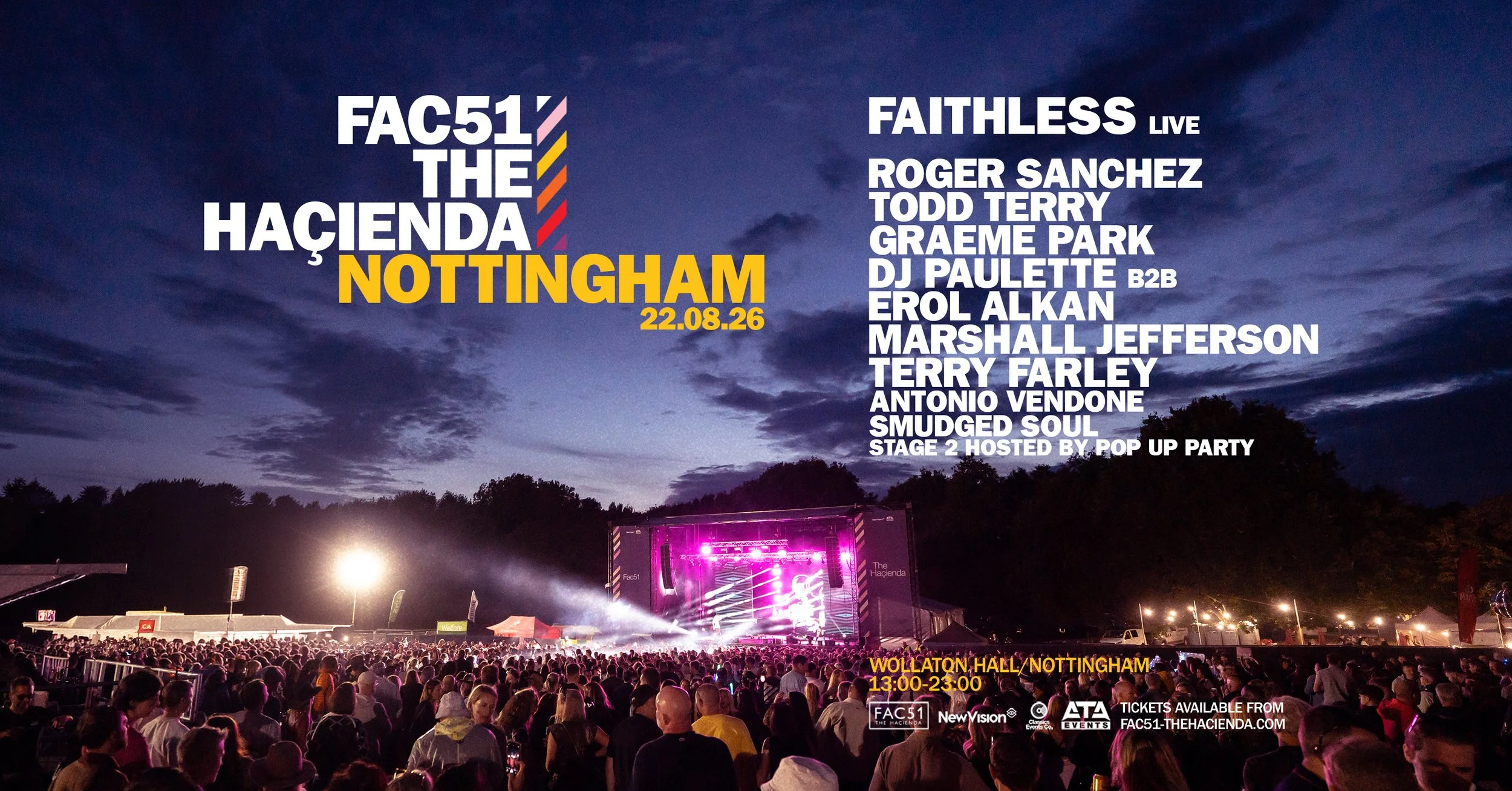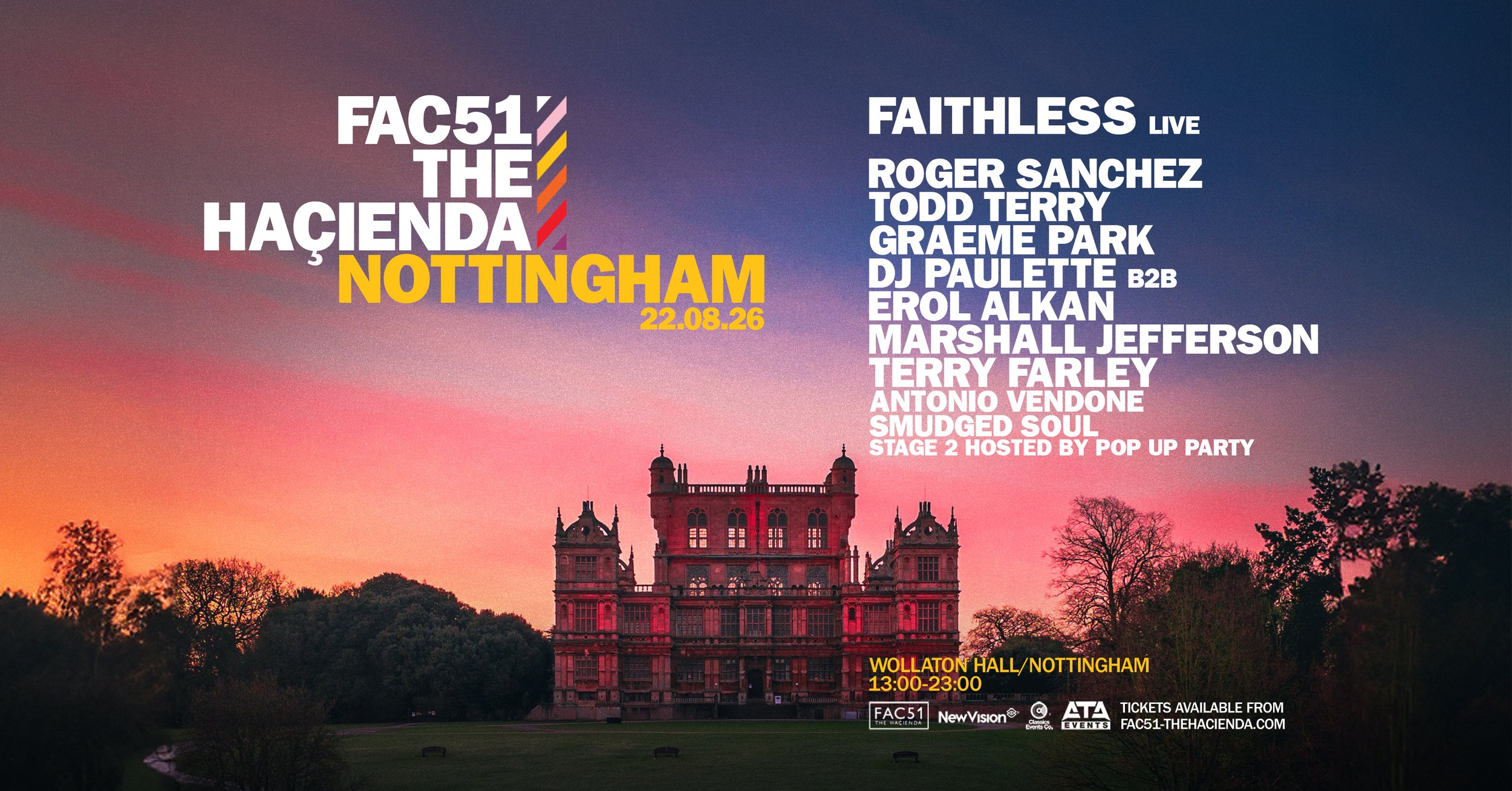 FAC51 The Haçienda returns to Wollaton Hall in Nottingham on Saturday 22nd August with a massive line up that includes Faithless, Roger Sanchez, Todd Terry, DJ Paulette, Erol Alkan, Marshall Jefferson, Terry Farley and more. Tickets from Skiddle.